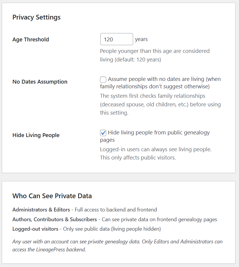 Automatic Privacy Rules: Instantly hide living individuals using smart, configurable age thresholds and relationship checks.