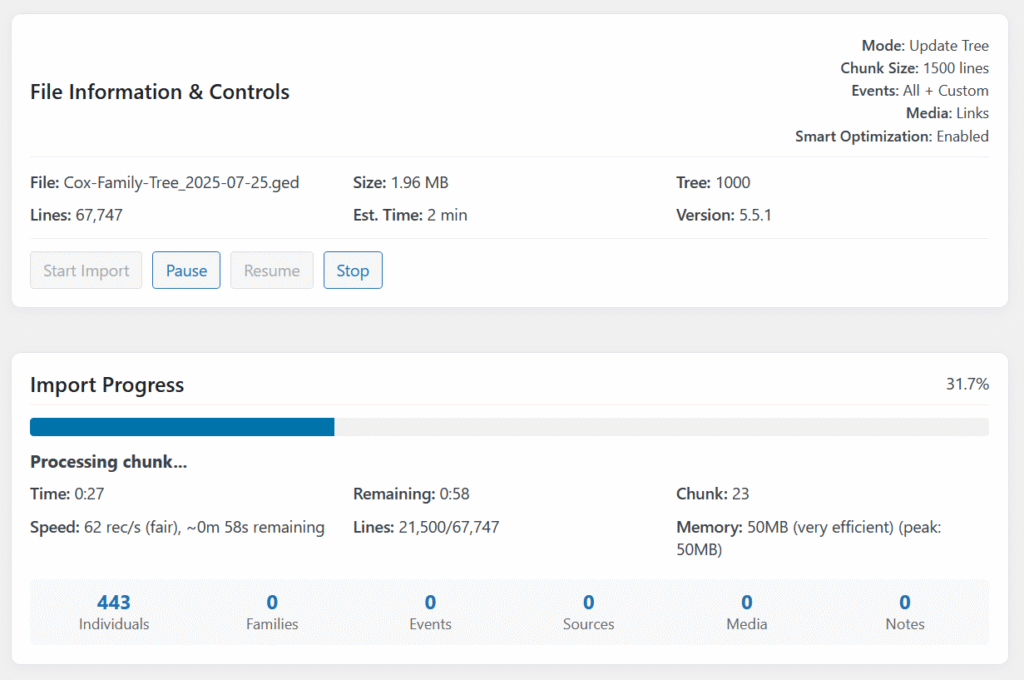 Effortless Import: Full support for GEDCOM 7.0 (and 5.5.x) with robust, timeout-proof chunked uploads.