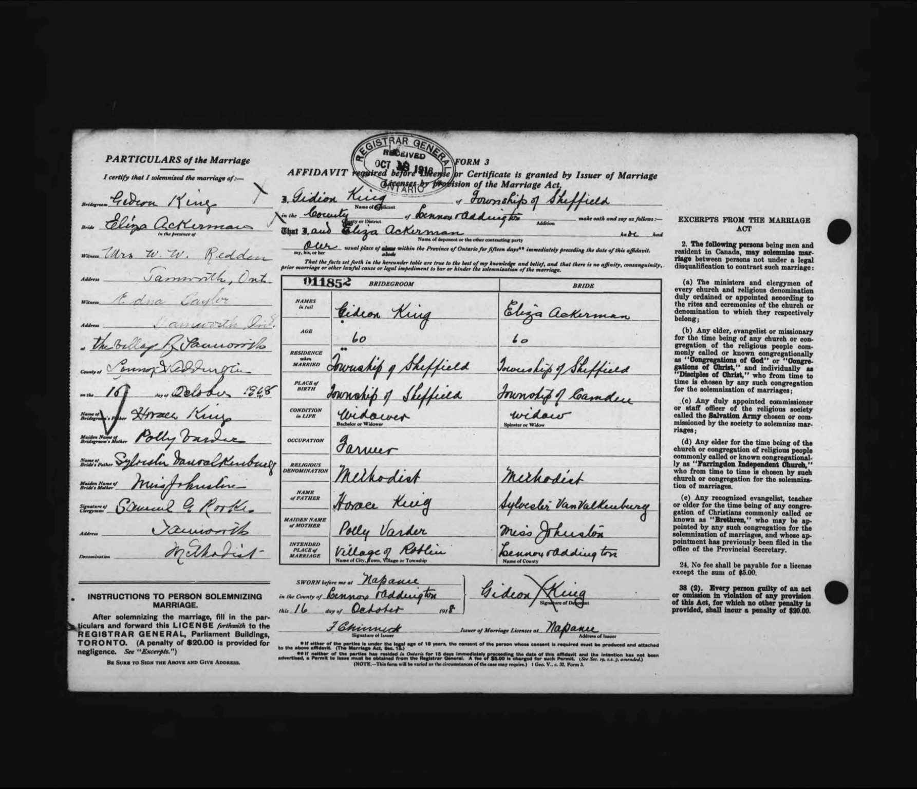 Archives of Ontario; Toronto, Ontario, Canada; Registrations of Marriages, 1869-1928; Reel: 49 Year: 1901; Census Place: Kennebec, Addington, Ontario; Page: 12; Family No: 110 |