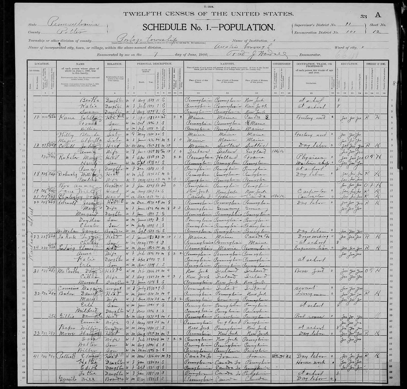 Year: 1900; Census Place: Portage, Potter, Pennsylvania; Roll: 1482; Page: 12; Enumeration District: 0101; FHL microfilm: 1241482 |