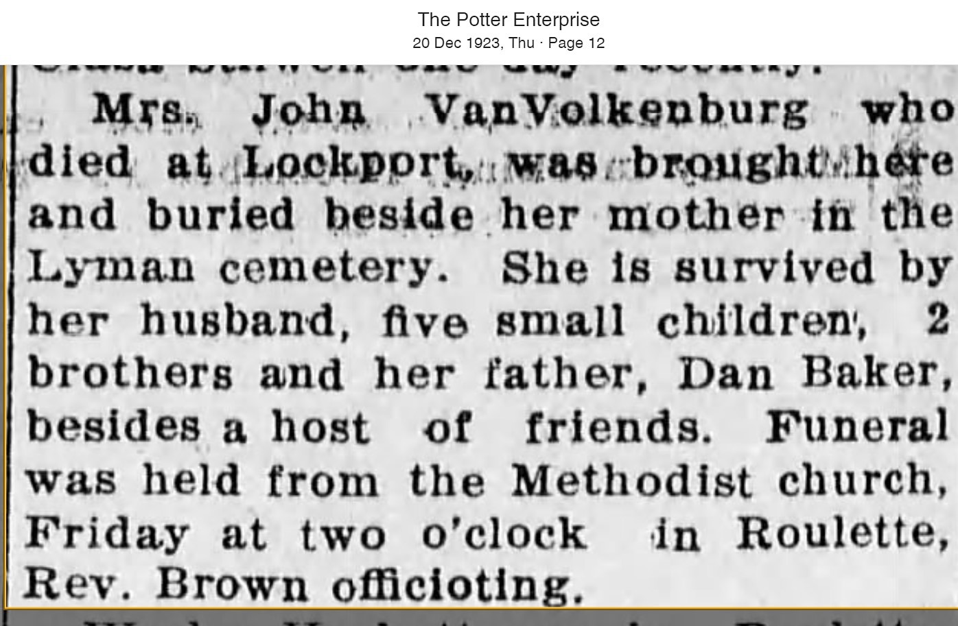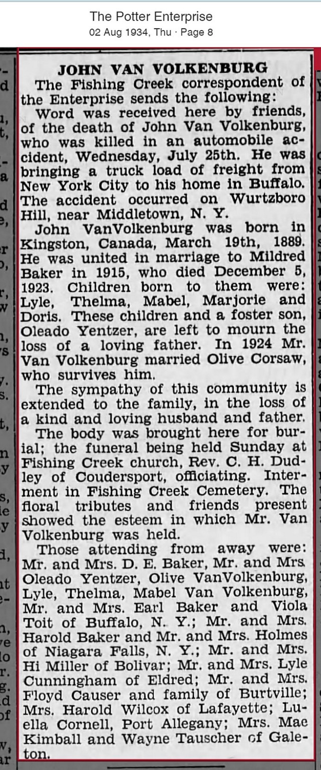 The Potter Enterprise; Publication Date: 2 Aug 1934; Publication Place: Coudersport, Pennsylvania, USA; URL: https://www.newspapers.com/image/277924287/?article=66e40e09-385f-42d6-807a-72c8702dedb6&focus=0.55412364,0.03598619,0.6889825,0.2740354&xid=3355 Year: 1900; Census Place: Portage, Potter, Pennsylvania; Roll: 1482; Page: 12; Enumeration District: 0101; FHL microfilm: 1241482 New York Department of Health; Albany, NY; NY State Death Index |