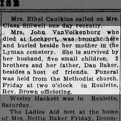 The Potter Enterprise; Publication Date: 14 Jul 1910; Publication Place: Coudersport, Pennsylvania, USA; URL: https://www.newspapers.com/image/277948087/?article=19fcf428-ebf0-40e3-8ada-a6f4c930d92b&xid=4716&terms=Miss_Mildred_Baker Year: 1910; Census Place: Austin, Potter, Pennsylvania; Roll: T624_1415; Page: 13B; Enumeration District: 0107; FHL microfilm: 1375428 |