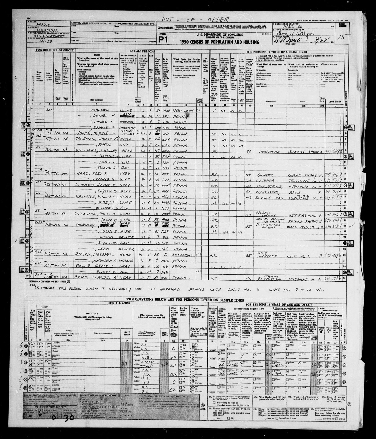 United States of America, Bureau of the Census; Washington, D.C.; Seventeenth Census of the United States, 1950; Record Group: Records of the Bureau of the Census, 1790-2007; Record Group Number: 29; Residence Date: 1950; Home in 1950: Lycoming, Pennsylvan |