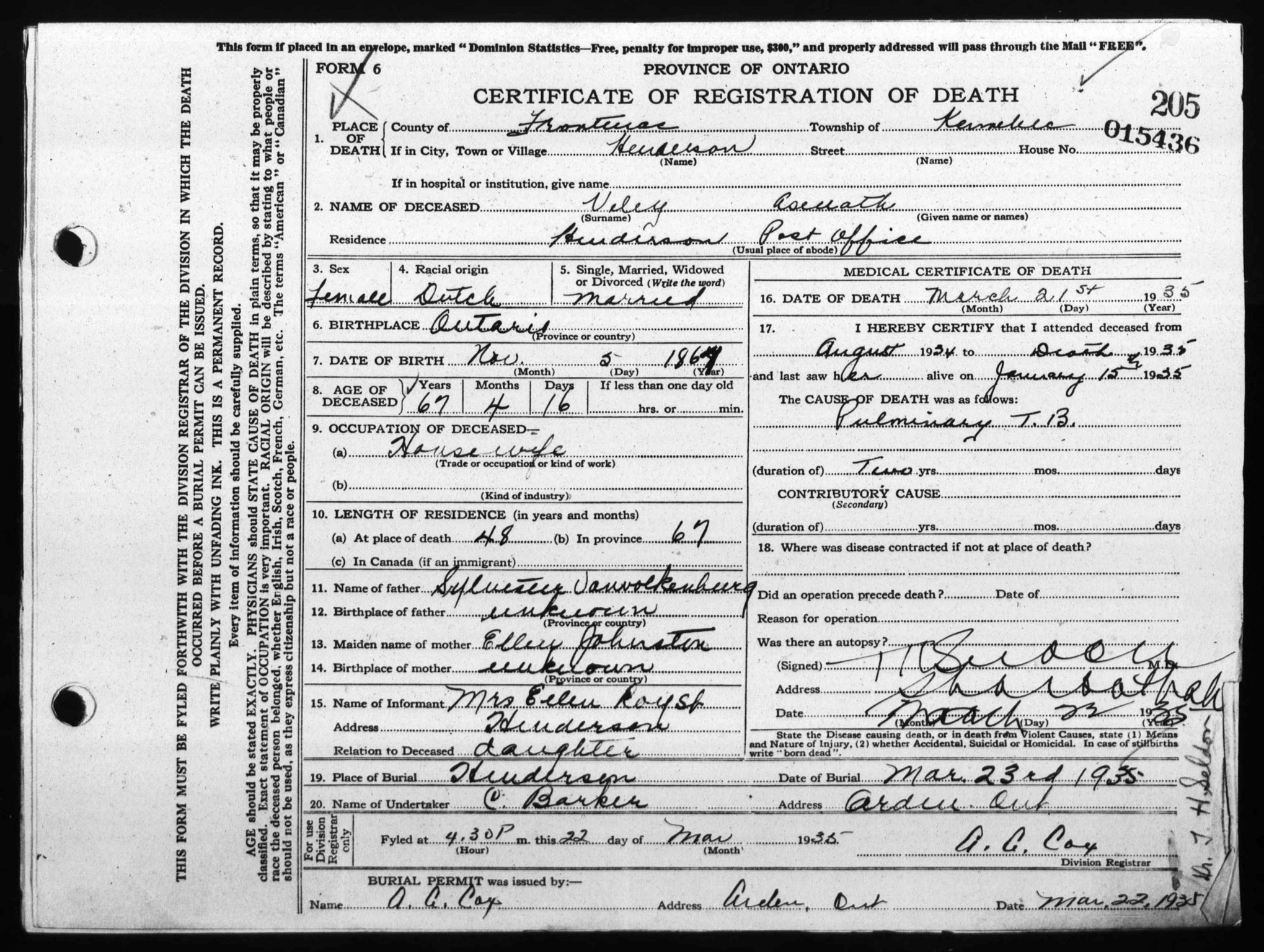 | Father | Sylvester Vanvolkenburgh , b. 3 NOV 1829 , Ontario , d. 21 DEC 1901 , Frontenac, Ontario, Canada (Age 72 years) |