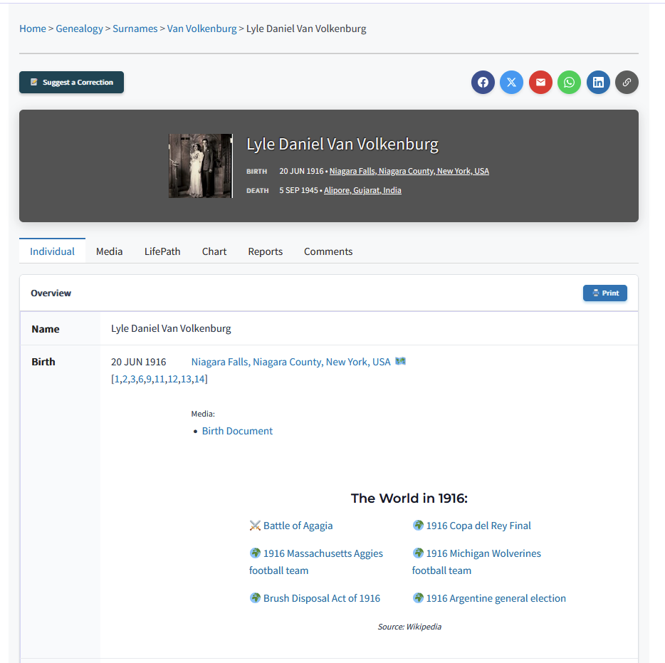 • Vital Stats: Full name, birth, and death dates/locations.