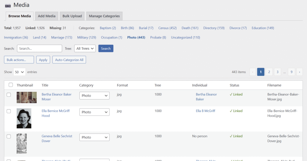 - Category: Assigned category (e.g., “Photo”, “Birth”, “Census”, “Uncategorized”).