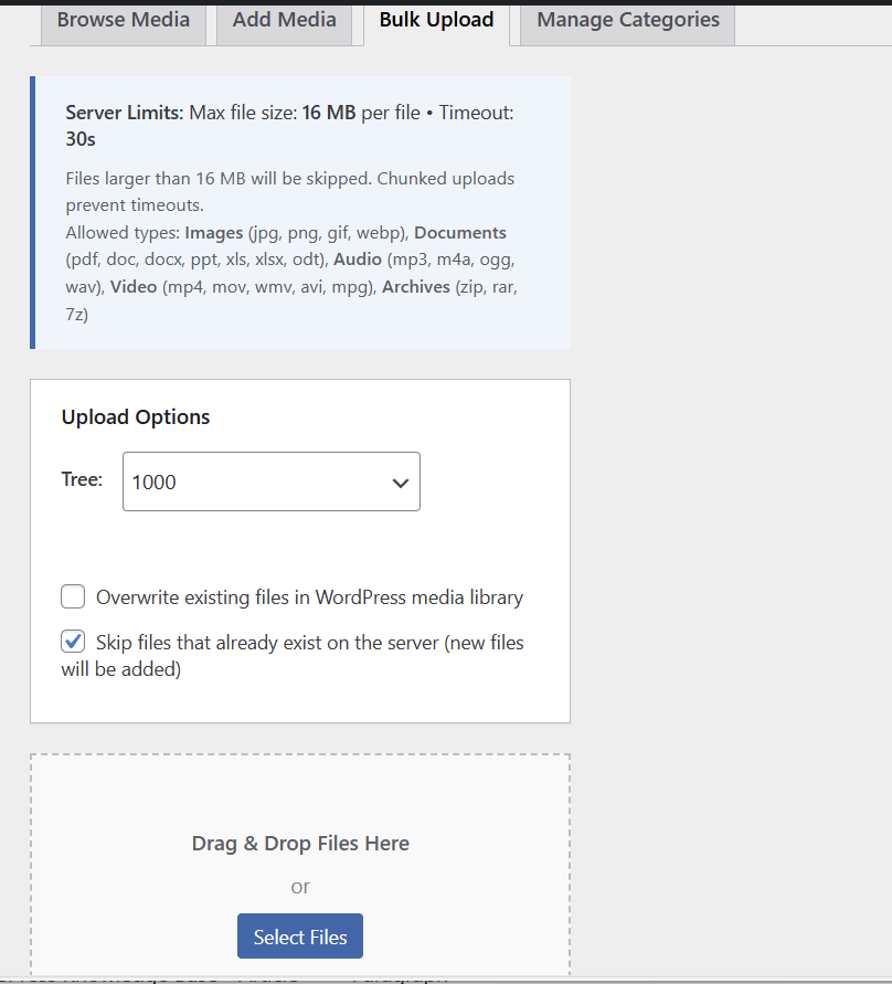 - Overwrite existing files: Replace files with matching names in WordPress Media Library.