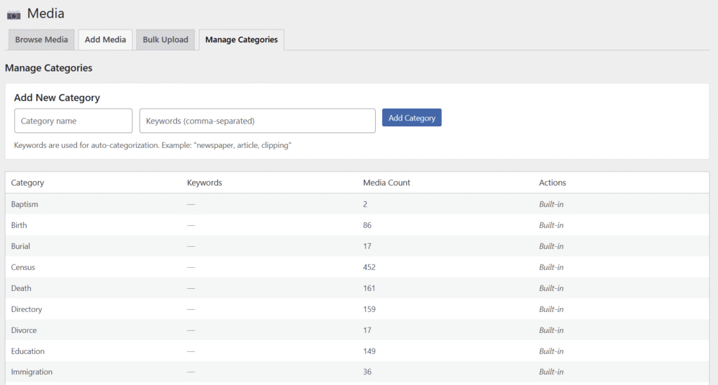 - Categories Table: Lists all categories, keywords, media counts, and available actions: