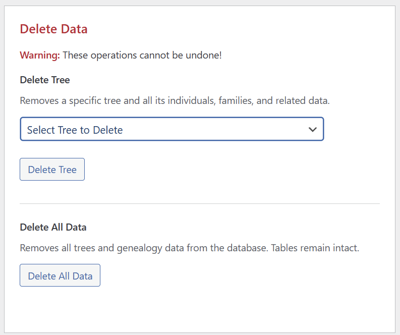 - Purpose: Permanently removes a specific family tree and all related records (individuals, families, media, places, and sources).