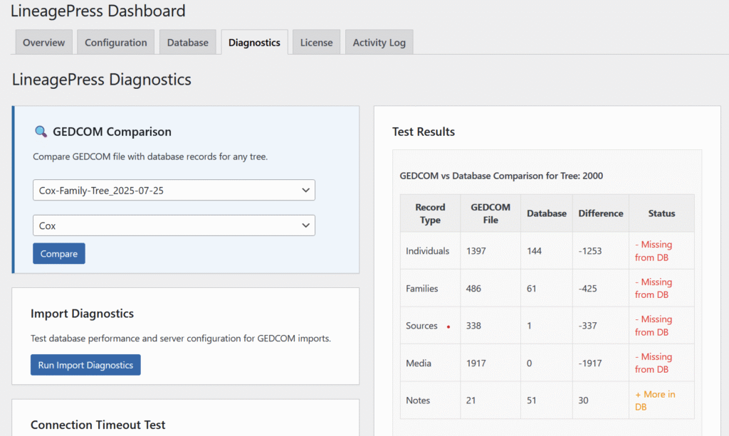 - Purpose: Compares a previously uploaded GEDCOM file against an existing LineagePress family tree to verify that all data was imported correctly. This helps identify discrepancies or missing records between the source file and your database.