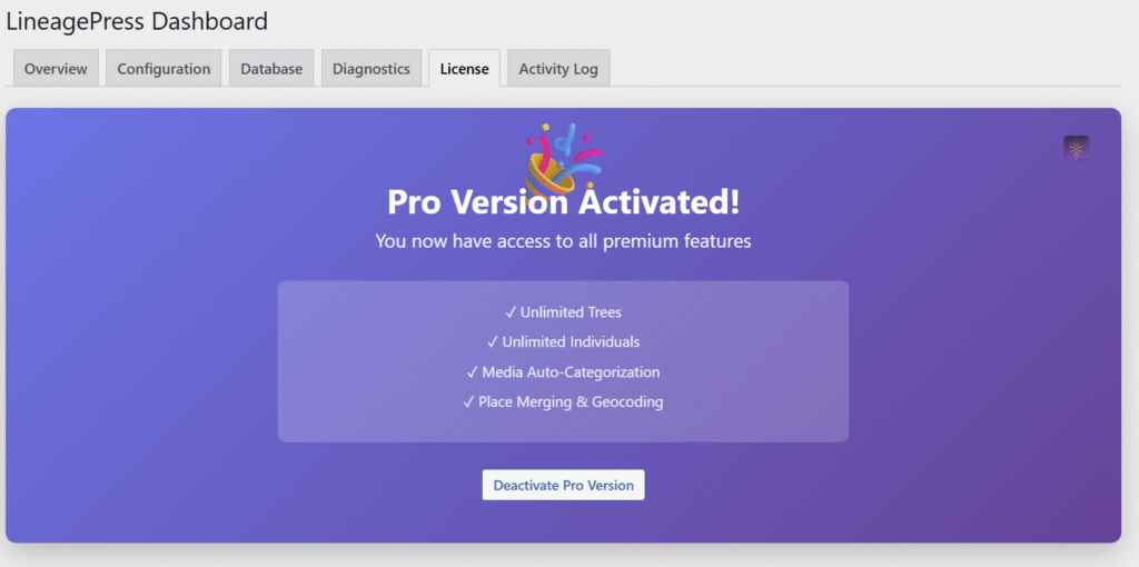 If your LineagePress Pro license is currently active, the License page will display a confirmation message and a list of premium features available under your license.