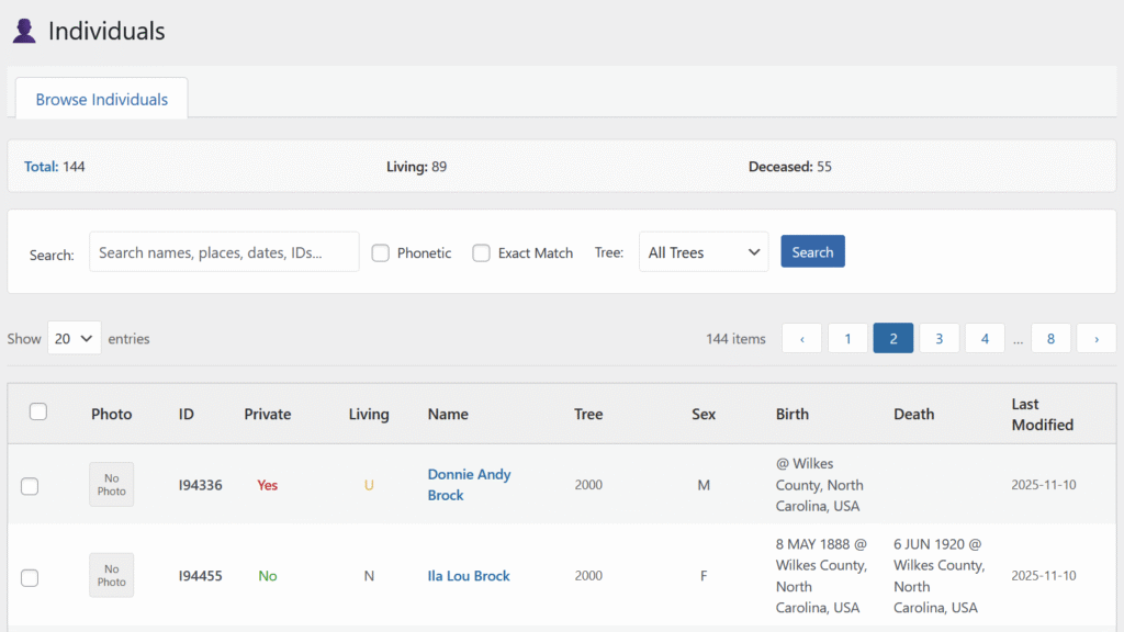 Navigate to LineagePress > Individuals in your WordPress admin dashboard to access this section.