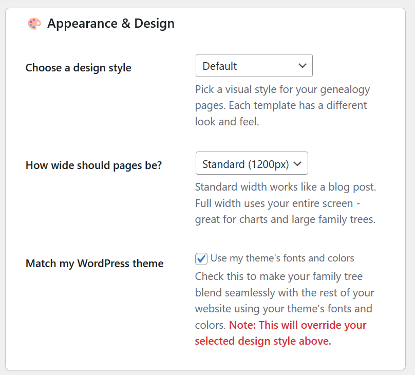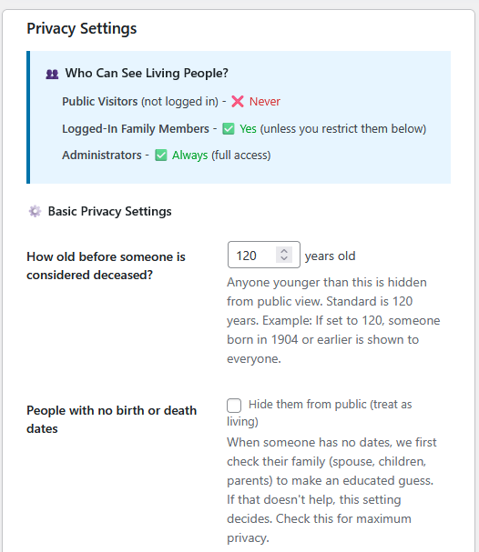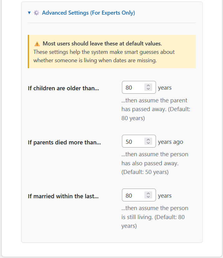 - Assume living with no dates: false (don’t hide people with no birth/death dates)