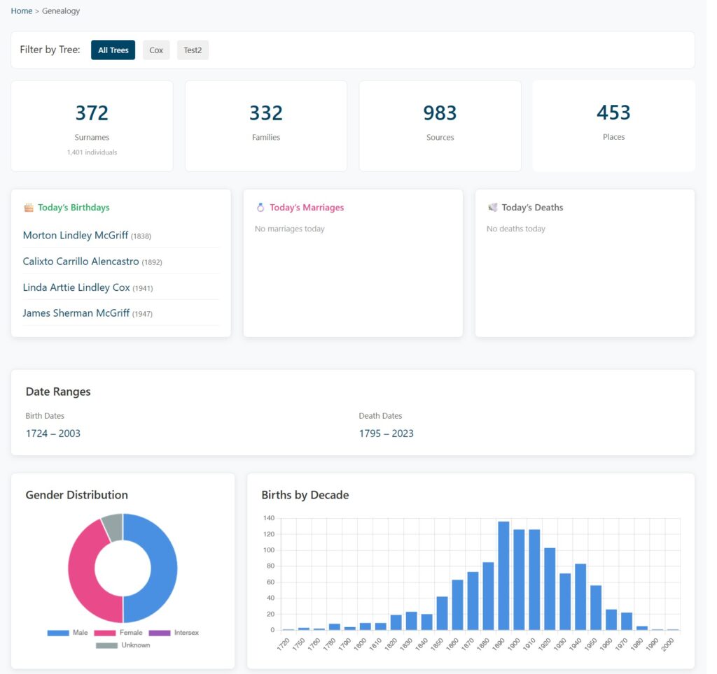 - Live Data: All statistics and charts update automatically after every successful GEDCOM import, requiring no manual configuration.