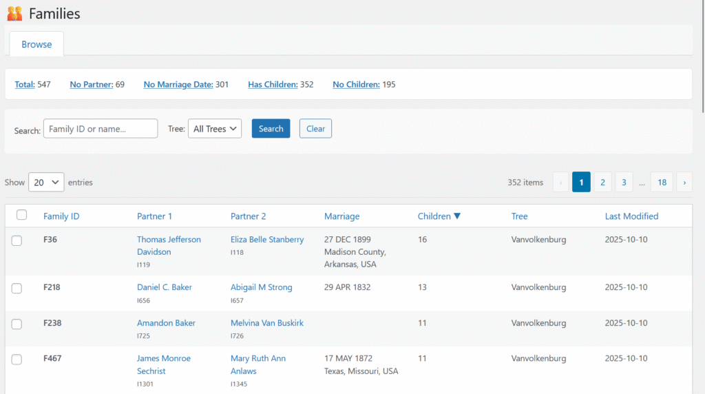 - Children Count: The number shown is only for children linked to that specific family record. Children from previous or subsequent marriages appear in those separate family records.