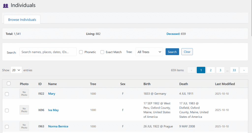 The Individuals page (Location: WordPress Admin → LineagePress → Individuals) is your primary workspace for viewing, searching, and organizing all the person records in your family trees.