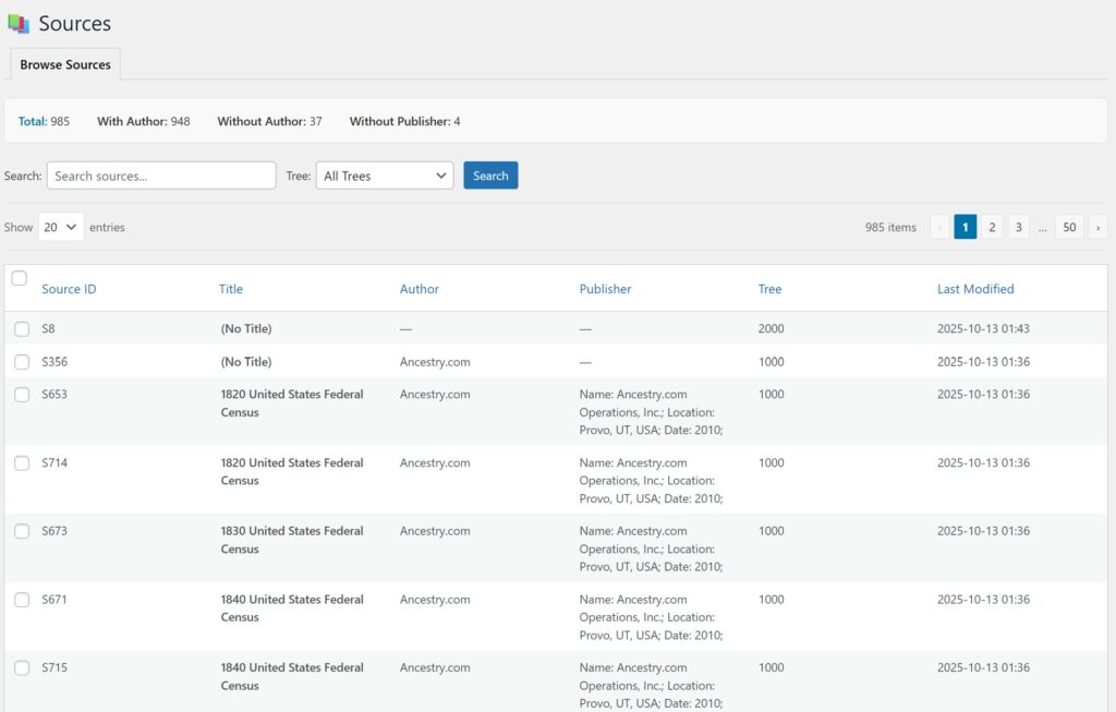 | Filter by Tree | Use the dropdown menu to restrict the list to sources from a specific family tree. |